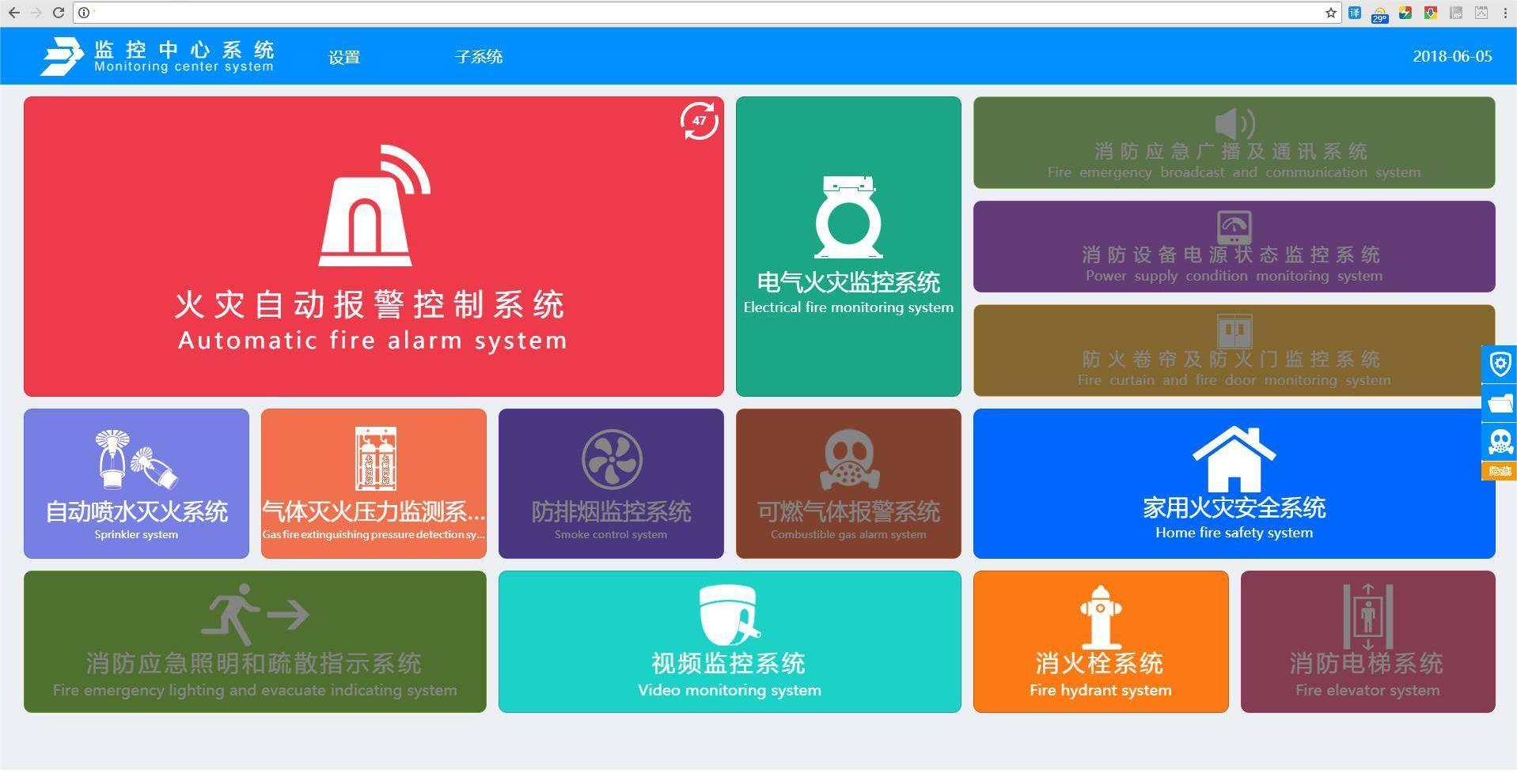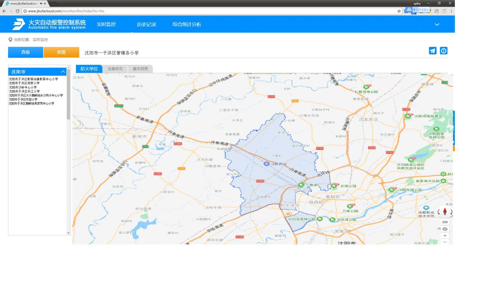 点击子系统选择界面上的火灾自动控制报警系统按钮,进入火灾自动控制报警系统界面,在查看界面可以根据区域选择查看选中区域的防火单位、设备状态(包括传输设备、GPRS和CRT)和基本信息。