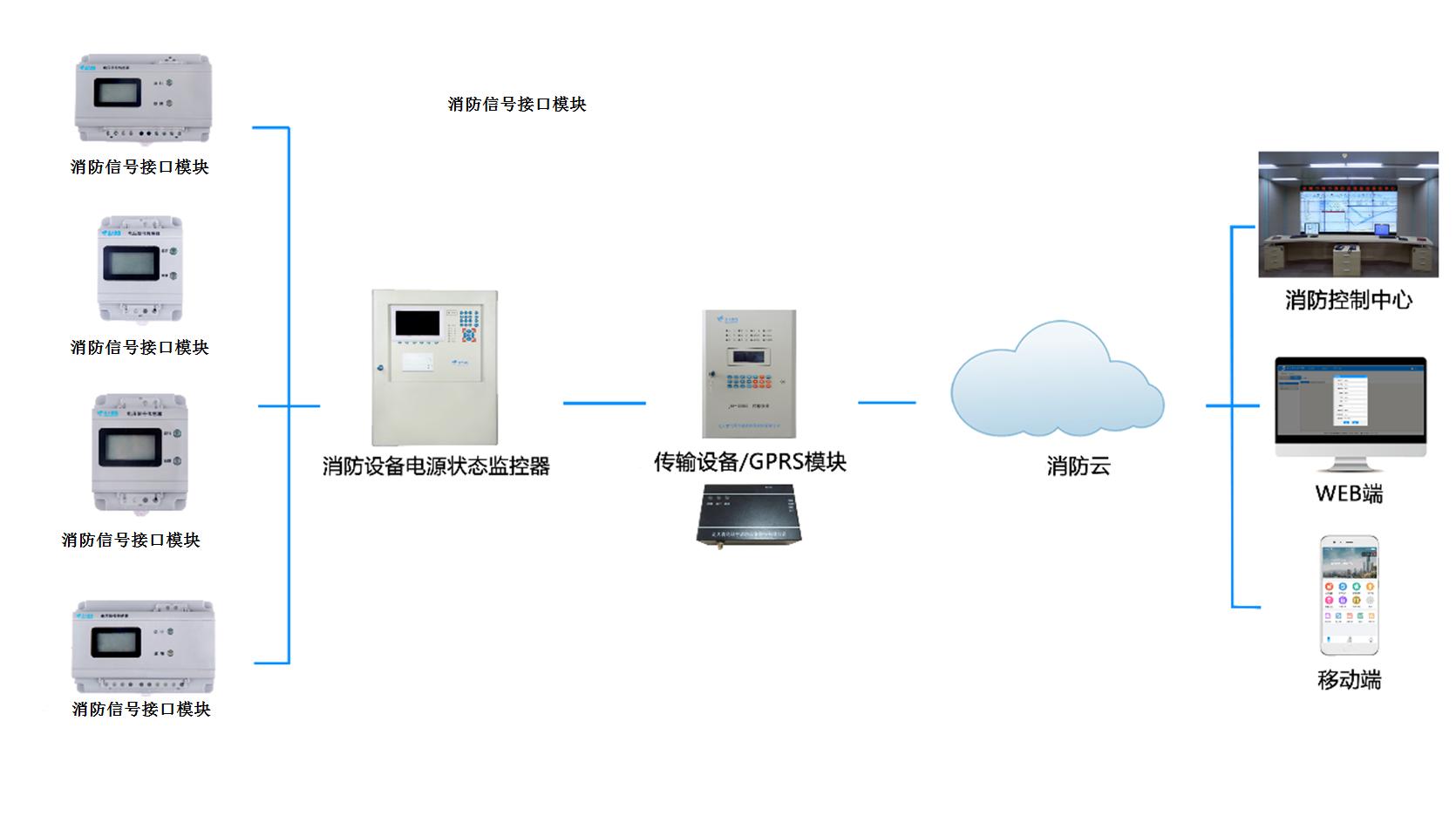 消防设备电源监控系统由消防设备电源状态监控器,电压信号传感器等设备组成。通过传输设备将消防设备电源状态监控器状态(包括是否存在供电中断、过压、欠压、过流、缺相、错相等故障)上传至青鸟消防云平台,实现警情实时监控和短信/语音等多方式告警。