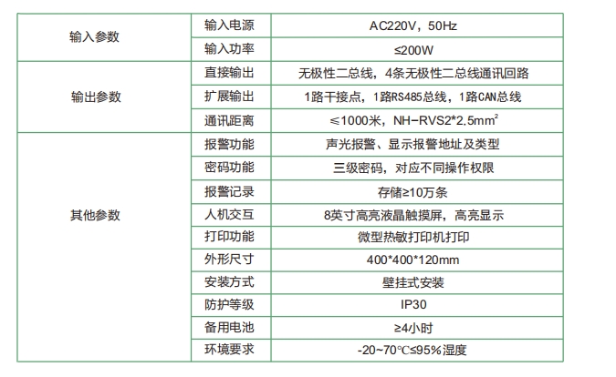 1、电源:① 额定工作电压AC220V50Hz ;备用电源:主电源欠压或停电时,维持监控设备工作时间 ≥4h。