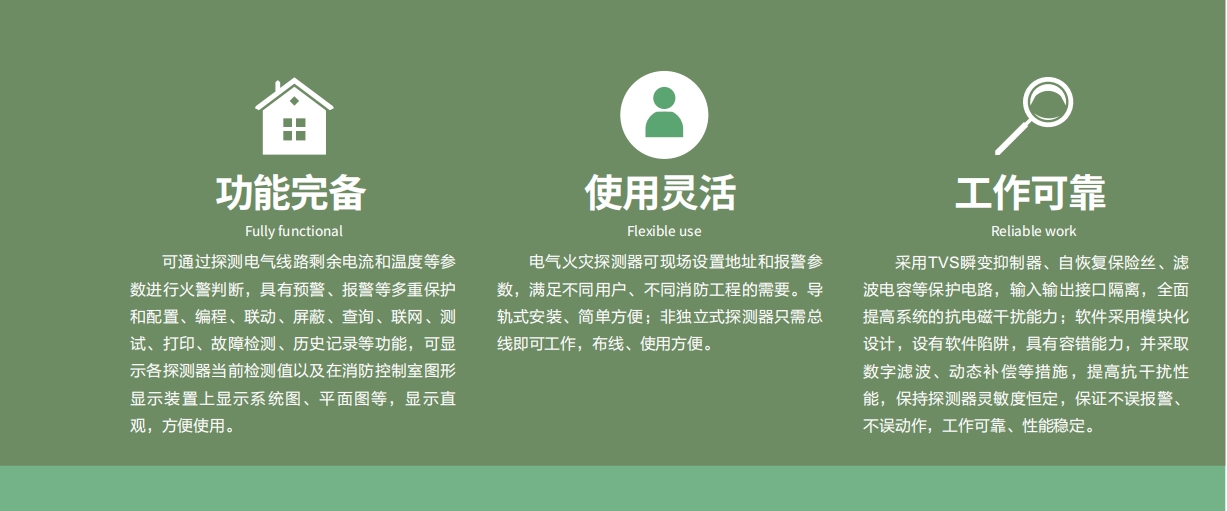电气火灾监控系统选用贴片元器件,采用最新的MCU控制IC通过采用SMD与接插相结合的方式进行生产组装,以高性能微控制器(单片机+嵌入式软件)作总控制器,通过powerbus供电总线每台探测器,对系统内所有受控回路的运行状态进行实时监控。